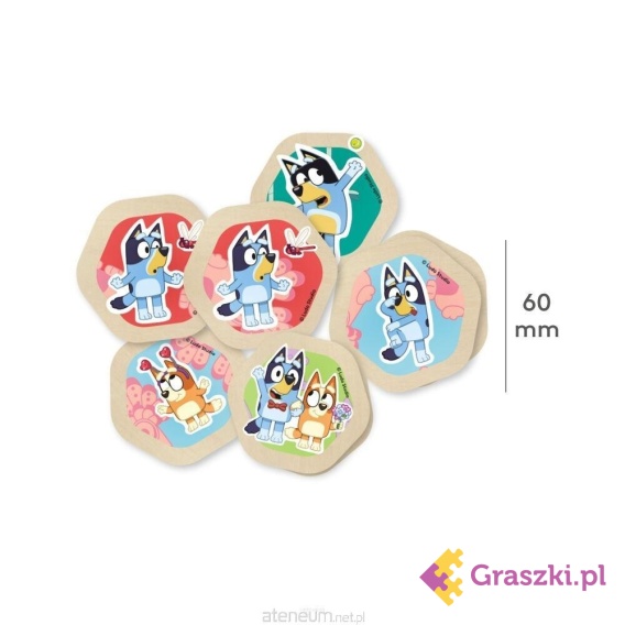 Urocza gra memory zawiera 38 kafelków w kształcie sześcianu (19 par) z oryginalnymi ilustracjami z kreskówki Bluey. Ta zabawka rozwija pamięć, skupienie oraz zdolność do planowania Twojego dziecka i zaprasza całą rodzinę do zabawy oraz zdobywania nowych doświadczeń w świecie przygód kochanej przez dzieci Bluey. Komplet został zaprojektowany w Szwecji i starannie wykonany z drewna pochodzącego ze zrównoważonych zasobów FSC. Zabawka jest odpowiednia dla dzieci od 3 roku życia.